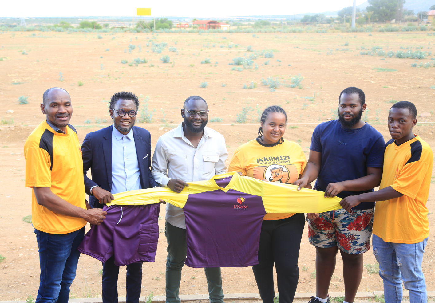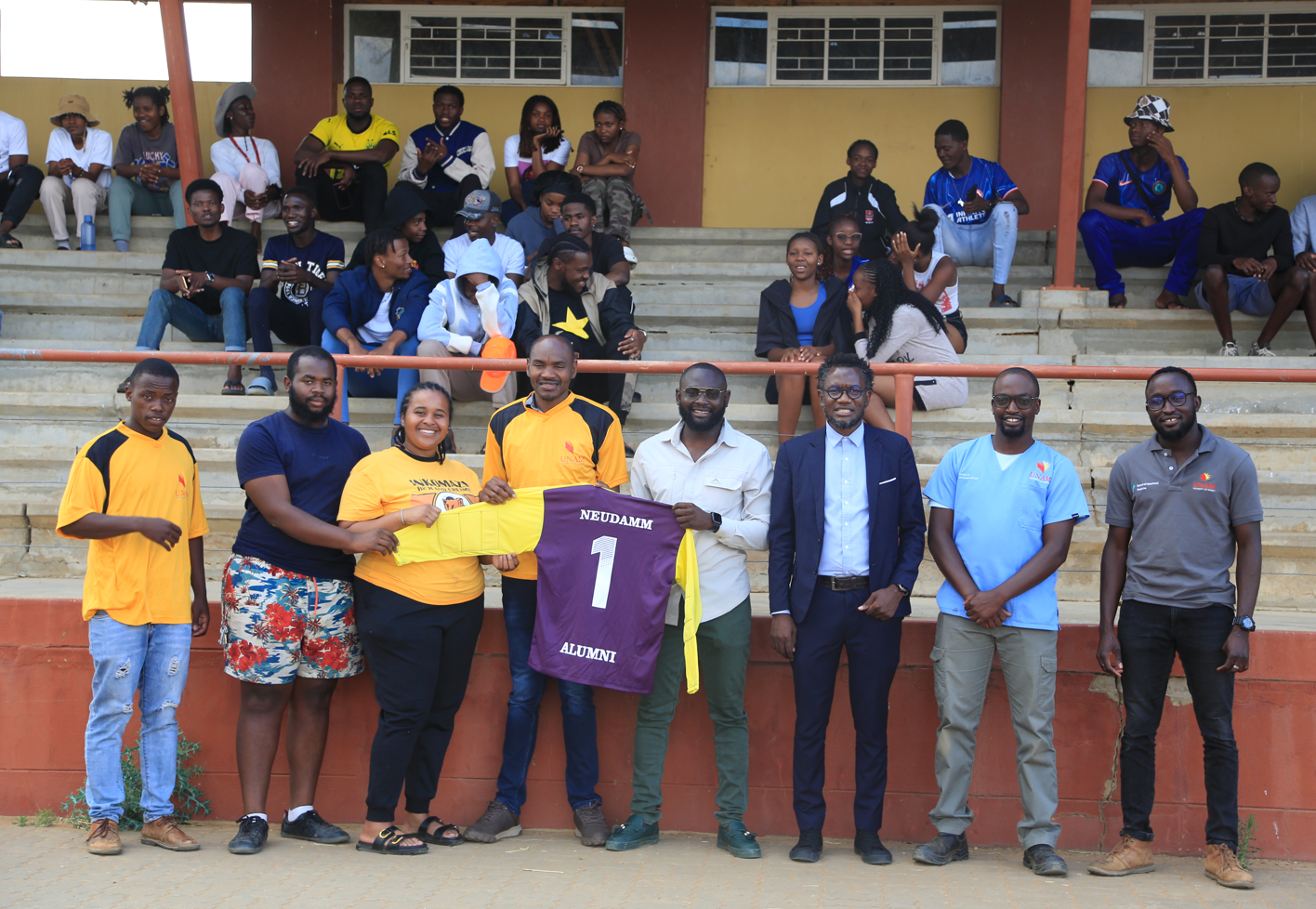 The initiative was spearheaded by Mr. Hiskia Athingo, Head Coach of the UNAM Neudamm Soccer Team, alongside Mr. Shiningayamwe and Dr. Kuume, who mobilised fellow alumni to support the team. The group of generous donors, includes Mr. Mauricio, Mr. Hitamuka, Mr. Kavari, Mr. Kandambo, Dr. Tjindunda, Ms. Gina, Mr. Hausiku, Mr. Silawa, Ms. Haidula, Dr. Kapimbua, and Dr. Nghinamito, all sharing one thing in common: deep pride in their Neudamm roots.